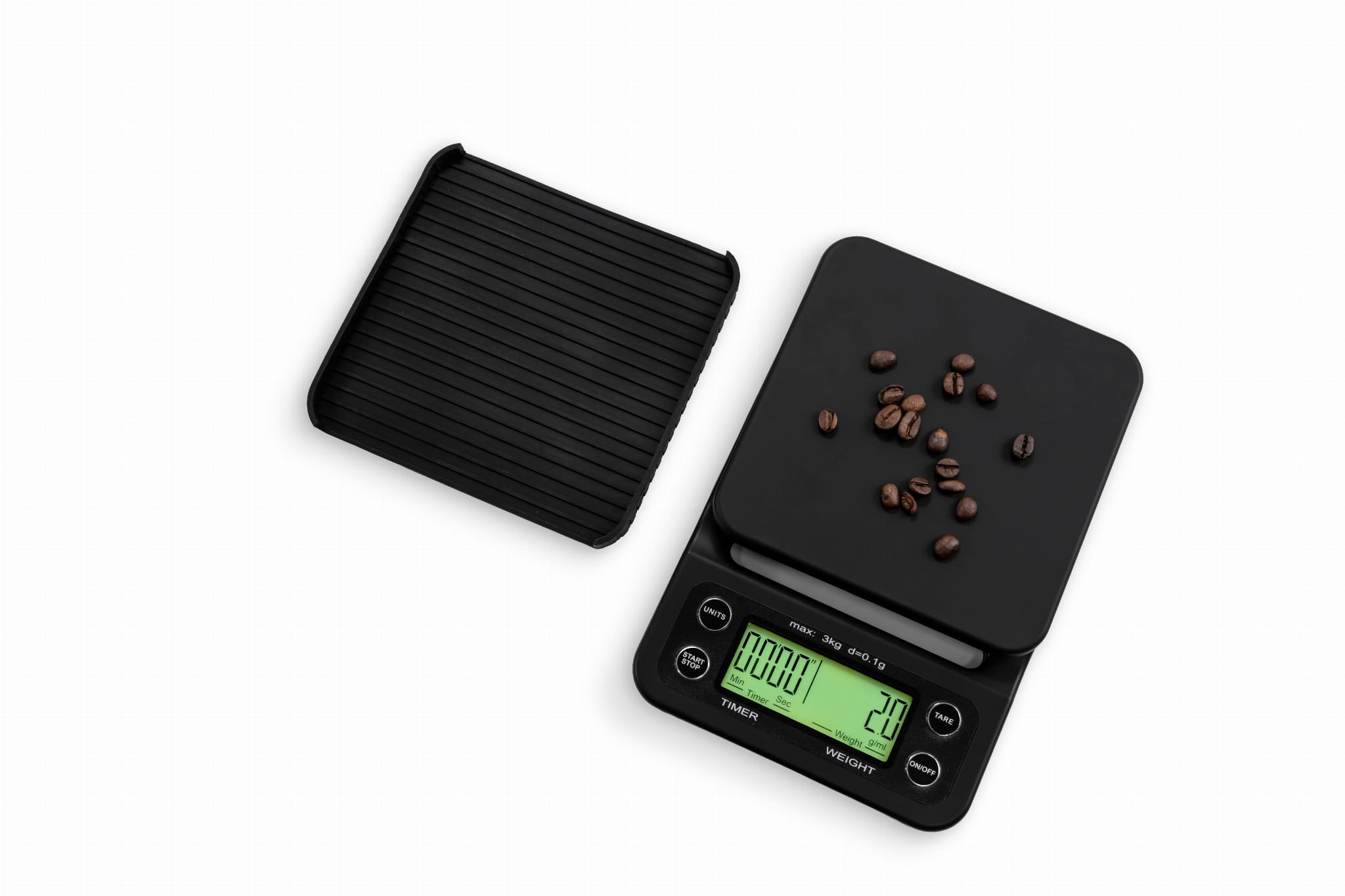 - Praktyczne Detale: Waga jest wyposażona w silikonową matę ochronną, która chroni platformę przed ciepłem filiżanek i ewentualnym rozlaniem.